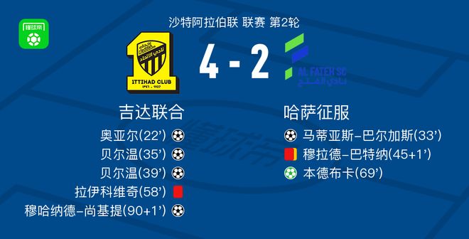 在9月13日,北京时代的沙特阿拉伯联盟第二次旋转中,吉达联队在国内对阵哈萨克斯坦。吉达(Jeddah)陪同Oyal得分,Berwin两次,Muhanad Shankiti得分。 Hazard征服了Matthias Vargas并得分,Bendbuka得分。最终得分吉达曼联4-2哈萨克萨特被征服了。在令人惊叹的时刻的22分钟内,吉达联队球员穆萨·迪亚比(Mousa Diabi)协助了奥亚尔(Oyal)的进球。在第33分钟,哈萨克征服了球员Murad Batna协助Matthias Vargas指出了进球。在35分钟内,吉达联队的球员贝尔温(Berwin)进球。在39分钟内,吉达联队的球员贝尔温(Berwin)进球。在停止上半场的第一分钟,哈萨克斯坦征服了穆拉德·巴特纳队获得了第二张黄牌。吉达联队Raikovic收到了红牌。在69分钟内,Hazard征服了球员Bend Buma,并获得了点球。在下半场停止的第一分钟,吉达联队球员Muhanad Shankiti Sco红色目标。团队阵容技术统计